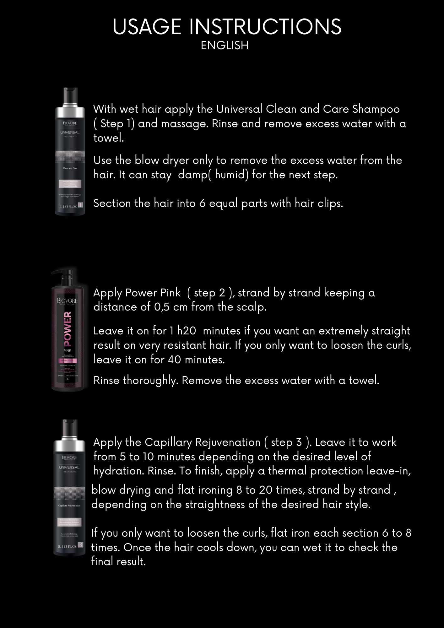 Notas: Respeta los tiempos de exposición y la temperatura de acuerdo con el tipo de cabello. Realiza siempre una prueba de sensibilidad o mechón antes del primer uso.
