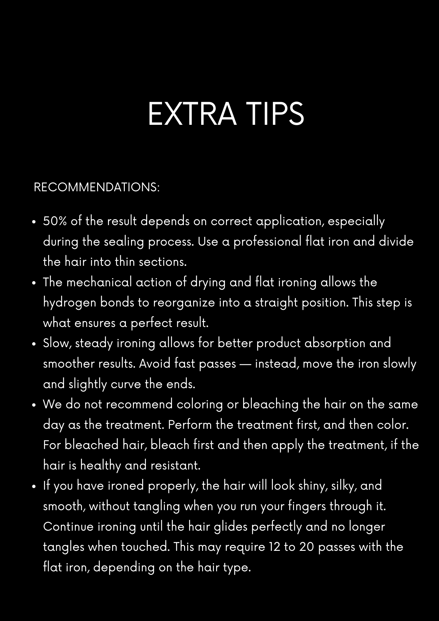 Aplica un leave-in con protección térmica. Seca con secador y plancha mechón por mechón:- Para un alisado completo: pasa la plancha de 8 a 20 veces por cada mechón, según el nivel de liso deseado.